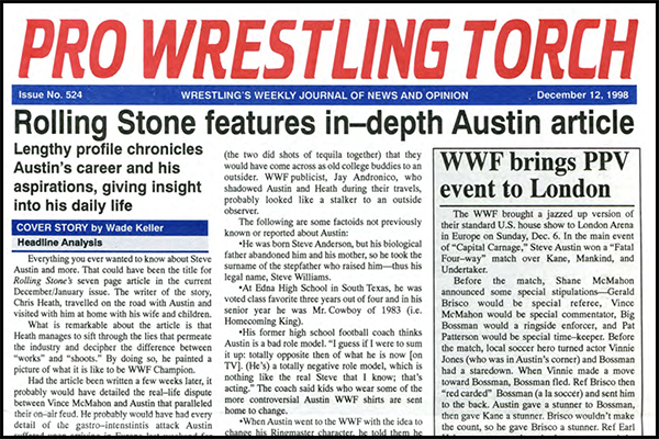 VIP 1998 BACK ISSUE – Pro Wrestling Torch #524 (December 12, 1998): Cover Story on Rolling Stone’s article on Steve Austin, One of Bruce Mitchell’s personal picks for his favorite columns he’s written – a tribute to Brian Hildebrand, more