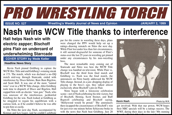 SUMMARY of #527 cover-dated January 2, 1998: This issue features a Cover Story on Kevin Nash’s WCW Title win over Goldberg at Starrcade… Details of Mankind’s first WWF Title win and one of the stranger WWF TV tapings ever… The latest on WCW’s (later-aborted) NBC specials planned for 1999… Detailed match analysis, Torch Roundtable, and Reader Reax to Starrcade… Reader letters reacting to the Bret Hart documentary… End Notes with Wade Keller on Nitro and Raw… Plus full coverage of Raw, Nitro, and ECW TV shows, full Newswires, and more…