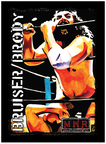 The MWR cards also introduced wrestling fans to an aspiring young artist: Rob Schamberger, whose artwork can be seen just about everywhere these days, from WWE toys and trading cards to the National Wrestling Hall of Fame in Waterloo, Iowa. Schamberger’s artwork appeared on MWR cards of Missouri legends like Bruiser Brody, Harley Race and more. Legendary Missouri wrestling announcer Larry Matysik teamed up with Barbara Goodish, Brody’s widow, to write the bio on the back of that card.