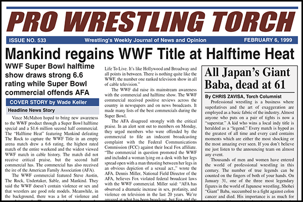 SUMMARY of #533 cover-dated February 6, 1999: This issue features detailed coverage of Mankind’s WWE Title win during Halftime Heat on USA Network during halftime of the Super Bowl… Chris Zavisa’s detailed obit on Giant Baba who died five years ago this week… Bruce Mitchell’s 8th Annual Year-in-Review Quiz… Wade Keller’s End Notes on Raw and Nitro… Full length insider Newswire reports on the WWF, WCW, ECW, and indy scene including news of Steve Austin being harassed at home and missing appearances because of it, Kevin Nash’s speech to WCW wrestlers, WrestleMania 15 news, news of Raw’s biggest ever win over Nitro in the ratings, heat between Konnan and Kevin Nash, and a lot more behind the scenes news during the Monday Night Wars… And more!