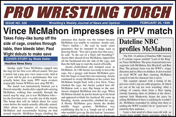 SUMMARY of #536 cover-dated February 20, 1999: This issue features a cover story looking at Vince McMahon’s first official match ever in the main event of the St. Valentine’s Day Massacre PPV event… Plus, Dateline NBC profiles McMahon… WWF Newswire covers The Public Enemy’s jump from ECW to the WWF and the secret to Big Show getting under the ring for the PPV angle… WCW Newswire covers a Hulk Honan-Jesse Ventura situation… ECW Newswire covers RVD’s article in High Times magazine and Paul Heyman’s desire to bring in outside investors… In-depth coverage of the WWF St. Valentine’s Day Massacre PPV with Steve Austin vs. Vince McMahon, Mankind vs. Rock, Kane & Chyna vs. Hunter & X-Pac… Letters to the Editor on a variety of topics… Full slate of TV reviews for Raw, Nitro, Heat, Thunder, ECW, and PPW… End Notes with Wade Keller with Random Thoughts on Raw and Nitro… And tons more behind the scenes info you won’t read anywhere else from the fascinating Monday Night War era…