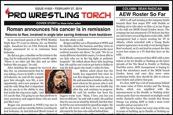 SUMMARY: This week’s PWTorch Newsletter includes Wade Keller’s cover story on Roman Reigns announcing his leukemia is in remission… Sean Radican’s column on AEW’s roster so far… Bruce Mitchell’s column on New Day and Kofi-mania… Greg Parks’s column on WWE Network’s five year anniversary… Keller’s TV reports on Raw, SD, and NXT… Torch Newswire… Keller’s End Notes constructing WrestleMania 35 line-up options…