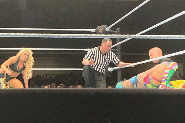 (6) Asuka wrestled Mandy Rose to a no contest when Asuka couldn’t finish. Mandy’s move on Asuka looked terrible and Mandy looked terrified after it happened. It looked like Asuka wanted to do a roll-through and Mandy was doing a wheelbarrow type face-buster and just went down right onto her head. So it was pretty clear they messed up. Mandy was looking scared. The ref called for one trainer. Then Fit Finlay and about three or four ohers came down. They talked to Asuka for about two minutes. The ref then updated Mandy on what was going on. Mandy was then trash-talking at them and Asuka. They announced it was a no contest. They helped Asuka back. Mandy then took the title on the stage and held it up.