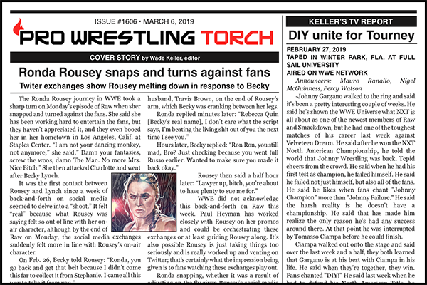 SUMMARY: This week’s PWTorch Newsletter includes Wade Keller’s cover story on Ronda Rousey and Becky Lynch going at it on social media and then Ronda turns on Raw… Greg Parks reviews “Fighting With My Family” movie… Keller’s WWE house show report… Keller’s reports on NXT TV, Raw, and Smackdown… Ringside Beat house show reports… Torch Newswire…
