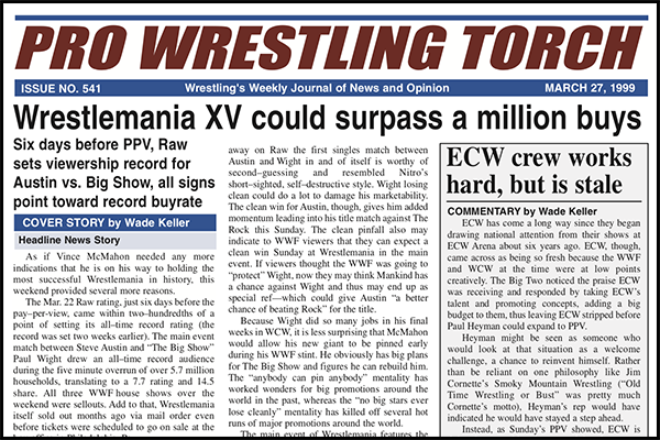 SUMMARY of #541 cover-dated March 27, 1999: This issue covers ECW’s Living Dangerously PPV with Wade Keller match-by-match analysis with star ratings, Torch staff Roundtable Reviews, Torch Reader Reax, and Poll results… The cover story looks at WrestleMania XV’s chances of reaching 1 million buys… Part four of the Torch Talk with Jim Brunzell includes Brunzell’s account of Hulk Hogan’s controversial jump from the AWA to the WWF… Plus WWF Newswire, WCW Newswire, ETC. Newswire, Wade Keller’s End Notes, and TV Reviews of Raw, Nitro, Heat, Power Pro, and Thunder…