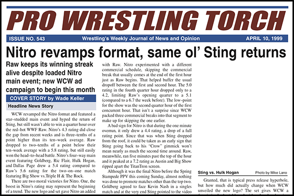 SUMMARY of #543 cover-dated April 10, 1999: This issue covers the revamping of WCW Nitro and the poor ratings showing despite considerable hype for the show’s makeover… Bret Hart talks about why he’s ashamed of the WWF and sells his quitting WCW… Detailed coverage of Nitro, Raw, Heat, Thunder, and Power Pro… Bruce Mitchell’s feature column on the WWF’s marketing of its product to children, how children are naturally drawn to the WWF, and how Vince McMahon often approaches or responds to controversy as a child would… End Notes with Wade Keller’s analysis of Nitro… An in-depth report on ECW Arena featuring RVD, The Dudleys, Balls, Shane Douglas, Taz, Chris Candido, Jerry Lynn, Tajiri, and more…