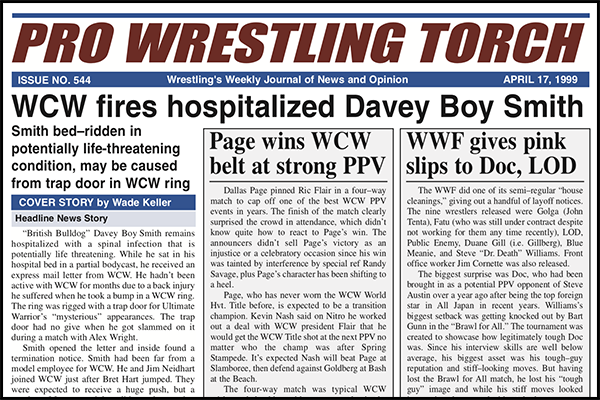 SUMMARY of #544 cover-dated April 17, 1999: This issue covers the firing of Davey Boy Smith by Eric Bischoff while Smith was hospitalized… WCW’s Spring Stampede PPV including Dallas Page capturing the WCW Title in a four-way match with Sting, Ric Flair, and Hulk Hogan including match-by-match coverage with Keller’s star ratings, Roundtable Reviews, and Reader Reax and Poll Results… WCW Newswire looks at how the political structure was staying put despite dipping ratings and bad morale… WWF Newswire looks at the anticipation of the pending deal with UPN for a new Thursday show… Tons of WCW and WWF insider notebook items… Reports on Raw, Nitro, ECW TV, Power Pro, Thunder, and Heat… Wade Keller’s End Notes… And more…