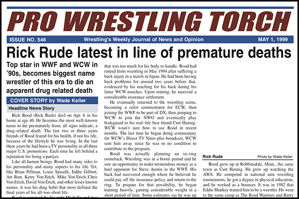 SUMMARY of #546 cover-dated May 1, 1999: This issue covers the death of Rick Rude… WWE Breakdown PPV headlined with Steve Austin vs. Rock and Triple H vs. X-Pac including Keller’s match-by-match anlaysis, Torch Roundtable Reviews, and Torch Reader Reax with Poll Results… Part five of the Jim Brunzell “Torch Talk” where gives the inside story on the mass exodus of AWA talent to the WWF in the ’80s… Wade Keller’s End Notes looks at Nitro’s struggle to close the ratings gap with Raw… Plus a triple-length WWF Newswire with insider backstage Monday Night War news, a WCW Newswire packed with insider news, detailed reports on Raw, Nitro, Heat, ECW TV, Thunder, and more…