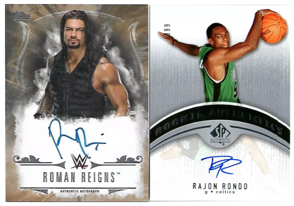 - Roman Reigns and Rajon Rondo. Reigns was a pioneer of lazy wrestling autographs. His 2013 Topps Best of WWE autograph was the hottest card in the hobby for a brief period in 2014, despite the sloppy “RR” signature. He’s signed thousands of cards since then, with little variation. Sometimes he adds an extra squiggle or an “X” after the second R, but that’s about it. Ditto for the former Boston Celtics star Rondo. The only real difference between the two is that Reigns signs his signatures with a slightly counterclockwise slant. Many of Ronda Rousey’s more recent autos have also started fading into a sloppy “RR” signature.