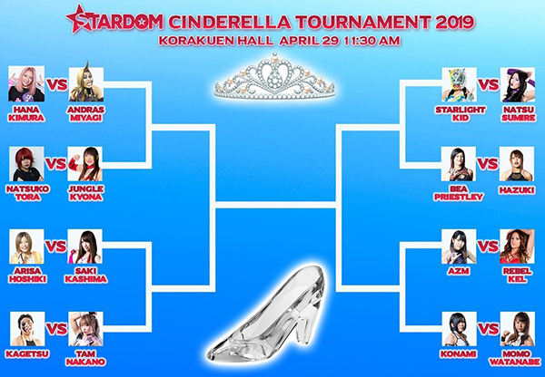 Rebel Kel, Azumi, Natsu Sumire, Starlight Kid, Hazuki, Bea Priestley, Saki Kashima, Arisa Hoshiki, Andras Miyagi, Hana Kimura, Tam Nakano, Natsuko Tora, Jungle Kyona, Konami, and Momo Watanabe were announced and each walked out on stage in Stardom t-shirts. No Kagetsu for some reason. The ring announcer ran through the list of first round matches. Ten minute matches in the first round through semi-finals. Victories can come via pinfall, submission, or over the top rope elimination.
