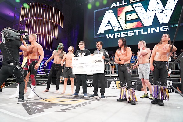 -Regarding the end of Fight for the Fallen, The Young Bucks were cutting an in-ring promo and seemed to be setting up a nice moment with Dustin & Cody Rhodes, who they had just beaten in the main event, but Kenny Omega’s music interrupted the segment for AEW’s presentation of their donation to the Fight for the Fallen Foundation. PWTorch sources indicate that someone hit Kenny’s music way before the que for him and the other wrestlers to come out and that’s when he came to the ring with Cody Rhodes, Brandi Rhodes, Luchasaurus, Jungle Boy, and Shad Khan among other to present the check to close the show.