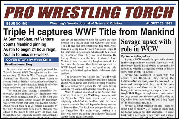 SUMMARY of #563 cover-dated August 28, 1999: This issue features a cover story on Mankind winning the WWF Title at Summerslam, with Jesse Ventura as special referee, then losing it 24 hours later on Raw to Triple H… The cover sidebar includes details of Randy Savage being upset with his role in WCW… WCW Newswire goes backstage for Eric Bischoff telling wrestlers at a meeting that if they weren’t happy, they could leave, and details who took up the offer… WWF Newswire covers five wrestlers no-showing a Winnipeg house show… ECW Newswire includes insider notes on Taz’s contract status… Keller’s Summerslam report with star ratings, plus Torch staff Roundtable Reviews, Torch Reader Reax, and Poll Results… Part four of the Jerry Lynn Torch Talk discussing ECW getting cleared on TNN… Plus Keller’s End Notes (on Ventura media coverage), Nitro review, Raw review, Heat review, Thunder review, ECW TV review, tons of indy results, and more…