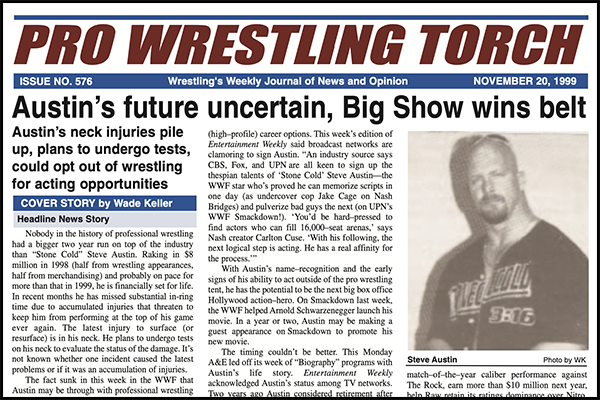 SUMMARY of #576 cover-dated November 20, 1999: This issue features a Cover Story titled “Austin’s future uncertain, Big Show wins belt” with first reports anywhere of Austin’s long-term in-ring career being in jeopardy due to neck problems and news of his engagement to Debra Marshall… Detailed Survivor Series coverage including Keller’s match reports and star ratings, plus Roundtable Reviews and Reader Reax… Part six of the Justin Credible “Torch Talk” with his thoughts on ECW getting a clearance on TNN… WWF Newswire details Chris Jericho’s rocky beginning in WWF injuring and hurting opponents… WCW Newswire covers a similar story of Steve “Dr. Death” Williams injuring opponents in his early WCW matches… Plus Raw review, Smackdown review, Nitro review, ECW TV Review, Power Pro TV Review, Wade Keller’s End Notes comments the exploitation of the emotions after Owen Hart’s death, Letters to the Torch, and more…