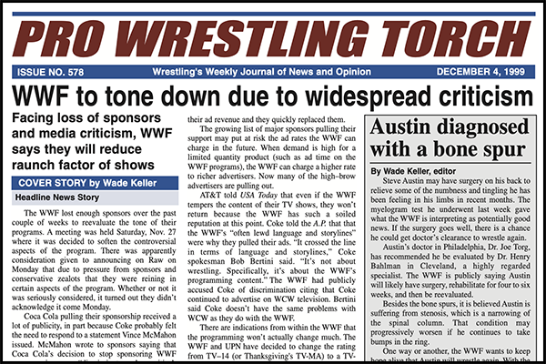 SUMMARY of #578 cover-dated December 4, 1999: This issue features a cover story on WWF’s decision to tone down the raunch in response to widespread criticism. Wade Keller’s “End Notes” column details why the controversy was so needless… Also, a cover sidebar includes an update on Steve Austin’s neck and his future in the ring… WWF Newswire reports that Mick Foley’s in-ring career was winding down… WCW Newswire reported on the backstage fight between Buff Bagwell and Dallas Page… ECW Newswire reports Shawn Michaels is interested in working for ECW, plus an argument backstage between Raven and Sandman… Part seven of the “Torch Talk” with Justin Credible includes his thoughts on what he didn’t like about his ECW stay… Bruce Mitchell writes a column titled “A Modest Book Proposal” feature proposals for several WWF books with the “moral of the story” for each… Plus ETC. Newswire, Raw Review, Nitro Review, Smackdown Review, other TV Reviews, End Notes explaining changes to the Torch, and more…