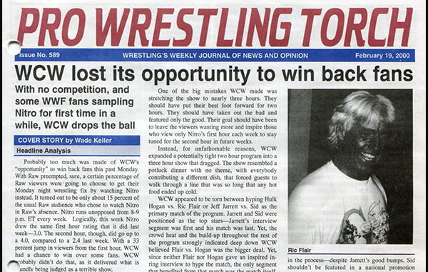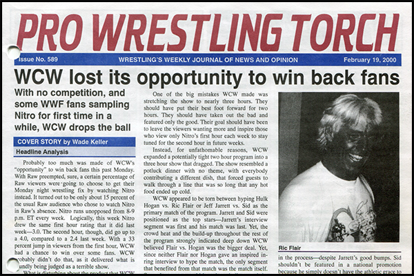 SUMMARY of #589 cover-dated February 19, 2000: This issue features a cover story on how WCW blew their opportunity to win over new fans with their unopposed Nitro when Raw was preempted… WCW Newswire covers Scott Hall’s conduct overseas, Shane Douglas being fired, and more problems behind the scenes… WWF Newswire features interview highlights with Vince McMahon and Triple H… Bruce Mitchell’s Ninth Annual Year-in-Review Quiz featuring 40 satirical, biting, ironic questions summing up the crazy year that was 1999… Plus ECW Newswire, reports on Raw, Nitro, Smackdown, ECW TV, and more…