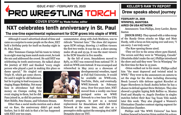 SUMMARY: This week’s PWTorch Newsletter features Wade Keller’s cover story on NXT’s 10th Anniversary… Bruce Mitchell on changing WM line-up… Greg Parks reviews the XFL after three weeks… Plus TV reports on NXT, Raw, Smackdown, and AEW Dynamite with expanded newsletter-exclusive Keller’s Analysis…