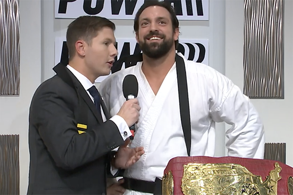 •SHOOTER STEVENS W/ GALLI – HIT: Shooter was at his best here. He dodged all of Galli’s questions about being a fighting champion and him running from matches and retaining his title in his TWO title defenses cheaply. None of this fazed Shooter though as he hung in there and slung his extra-long third degree black belt around Galli’s shoulder. Question Mark eventually came out and did his whole KAH-RAH-TAY thing but Shooter was the star here. He was able to be funny without being hammy and that’s how I like Shooter.