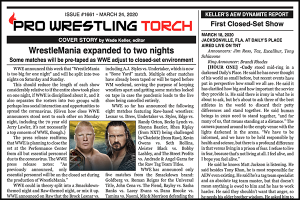 SUMMARY: This week’s PWTorch Newsletter features Wade Keller’s Cover Story on WrestleMania expanding to two nights… Greg Parks’s columnist with details on the streaming options available for you to get your wrestling fix… Torch Newswire… TV Reports on Raw, Smackdown, AEW, and NXT… And more…