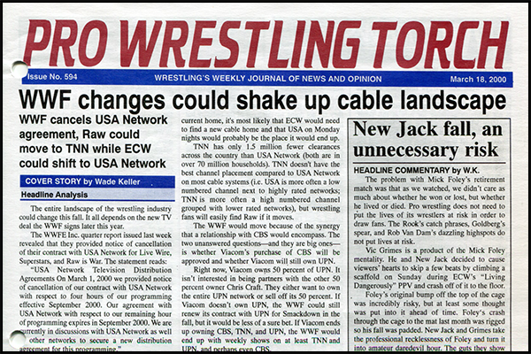 SUMMARY of #594 cover-dated March 18, 2000: This issue features a cover story analysis of the upcoming changes in the TV landscape with the WWF leaving USA Network for TNN… Detailed coverage of ECW’s Living Dangerously PPV… Wade Keller’s feature editorial looking at the pros and cons of the potential of ECW taking WWF’s spot on USA Network… WWF Newswire with details of Steve Austin’s recovery, William Regal signing, and Shawn Michaels’s media interview… WCW Newswire on Gene Okerlund being arrested, the latest on the booking committee changes, and more… ECW Newswire with details on New Jack’s big bump at the PPV… Letters to the Torch… Reviews of Raw, Nitro, Smackdown, ECW on TNN, and other shows…