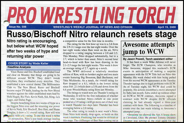 SUMMARY of #598 cover-dated April 15, 2000: This issue features a cover story on the relaunch of Nitro after a week off with Vince Russo and Eric Bischoff in charge… The cover sidebar reports on ECW Champion Mike Awesome’s attempt to jump to WCW without dropping the ECW Title first… Part one of the Torch Talk with Lance Storm… WWF Newswire with buyrate news on WrestleMania along with backstage news including Tazz being ribbed… WCW Newswire with tons of backstage news… ECW Newswire with the status of Rob Van Dam’s contract and heat between New Jack and Vic Grimes… Wade Keller’s feature editorial titled “The Old Guard Still in Charge” regarding the changes in WCW… Keller’s End Notes looks at the new Nitro… Plus reports on Raw, Nitro, Smackdown, ECW, and other shows, and Letters to the Torch, ETC. Newswire, and more…