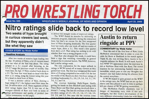 SUMMARY of #599 cover-dated April 22, 2000: This issue features a cover story on the crash of Nitro’s ratings in just week two of the Vince Russo/Eric Bischoff Era, plus a feature editorial by Wade Keller regarding Russo’s booking style, and a Keller’s End Notes about the Russo-Hogan Dynamic… WWF Newswire details USA Network’s lawsuit regarding the WWF-Viacom TV agreement… WCW Newswire with details on Sid no-showing Nitro… ECW Newswire details Mike Awesome’s controversial attempt to skip town with the ECW Title belt… Detailed coverage of the WCW Spring Stampede PPV including Keller’s Match Report with star ratings, Roundtable Reviews, and Reader Reax with Poll Results… Plus reports on Raw, Nitro, Smackdown, ECW, and more…