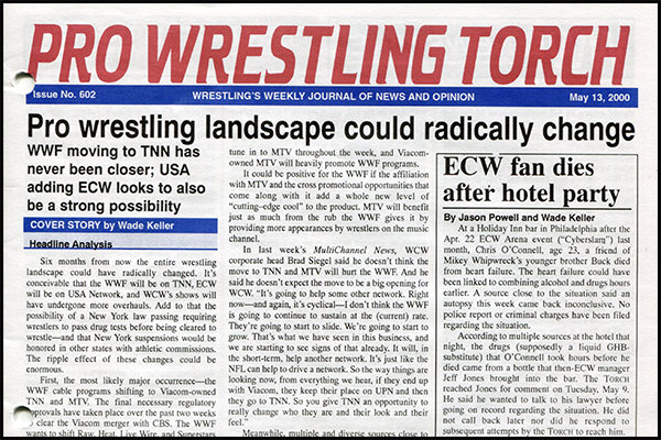 SUMMARY of #602 cover-dated May 13, 2000: This issue features a cover story on the changing TV landscape in pro wrestling with the WWF moving from USA to TNN and the potential of ECW to shift from TNN to USA… A sidebar cover story reports on the death of an ECW fan after a hotel party… WWF Newswire reports on Tazz’s injury and surgery and Raw ratings success… WCW Newswire covered Dallas Page’s near disaster while practicing for his PPV match, Kanyon’s future up in the air, Brad Siegel’s work hours, and more… ECW Newswire reports on Sandman and New Jack getting into a locker room fight and ECW’s TV situation… Detailed coverage of WCW Slamboree featuring Ric Flair vs. Shane Douglas, David Arquette defending the WCW Hvt. Title, Hulk Hogan vs. Kidman, and Sting vs. Vampiro with Keller’s Match Report and Star Ratings, Roundtable Reviews, Reader Reax, and Poll Results… Keller’s full page feature editorial on Brad Siegel’s interview about WCW’s changes… Plus Keller’s End Notes, reports on Raw, Nitro, Thunder, Smackdown, and ECW on TNN, and more…