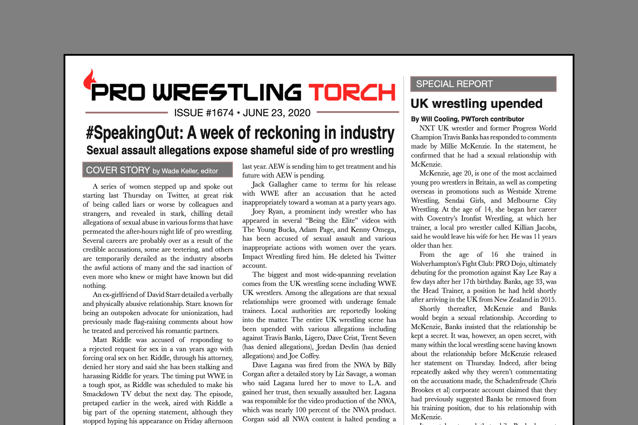 SUMMARY: This week’s PWTorch Newsletter features Wade Keller’s cover story on the Speaking Out hashtag sparking a reckoning in industry… Keller’s “Page 2 News” looks at ramifications of Speaking Out movement and actions already taken by promoters, plus comparing AEW and NXT viewership before and after pandemic and fan-free shows… Zack Heydorn’;s debut newsletter column on the rightfully acclaimed Undertaker documentary series on WWE Network but the key factor that WWE ignored… Greg Parks column on age of featured wrestlers in promotions… Wade Keller’s “End Notes” column on the steps AEW and WWE ought to be taking during the pandemic that they’re not both for safety and to normalize precautions and set a good example… Will Cooling’s special report on the upending of the BritWres scene with Speaking Out revelations… Keller’s reports on Raw, Smackdown, and Dynamite… More