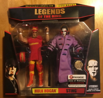- Hulk Hogan and Sting Ringside Collectibles Exclusive Legends of the Ring Two-Pack. During an episode of TNA Impact in the early days of the Hulk Hogan-Eric Bischoff regime, babyface Sting attacked babyface Hogan and left him bloodied in the process, apparently turning heel. Except it wasn’t really a heel turn, because Sting knew all along Hogan and Bischoff were bad dudes planning on stealing TNA from Dixie Carter. Did you follow all that? No matter. That convoluted angle produced a couple of really cool action figures. Hogan has a bloodied face and is wearing red and yellow tie-dyed pants, with removable Hulkamania T-shirt, bandana and weight belt. The Sting figure is the real gem of this two-pack, sporting a really cool purple, black and red removable trench coat, along with the TNA World Title belt and a black baseball bat. Recent sales for packaged figures have ranged from $90 to $175, and complete loose figures sell for about $70-$90 for the pair.
