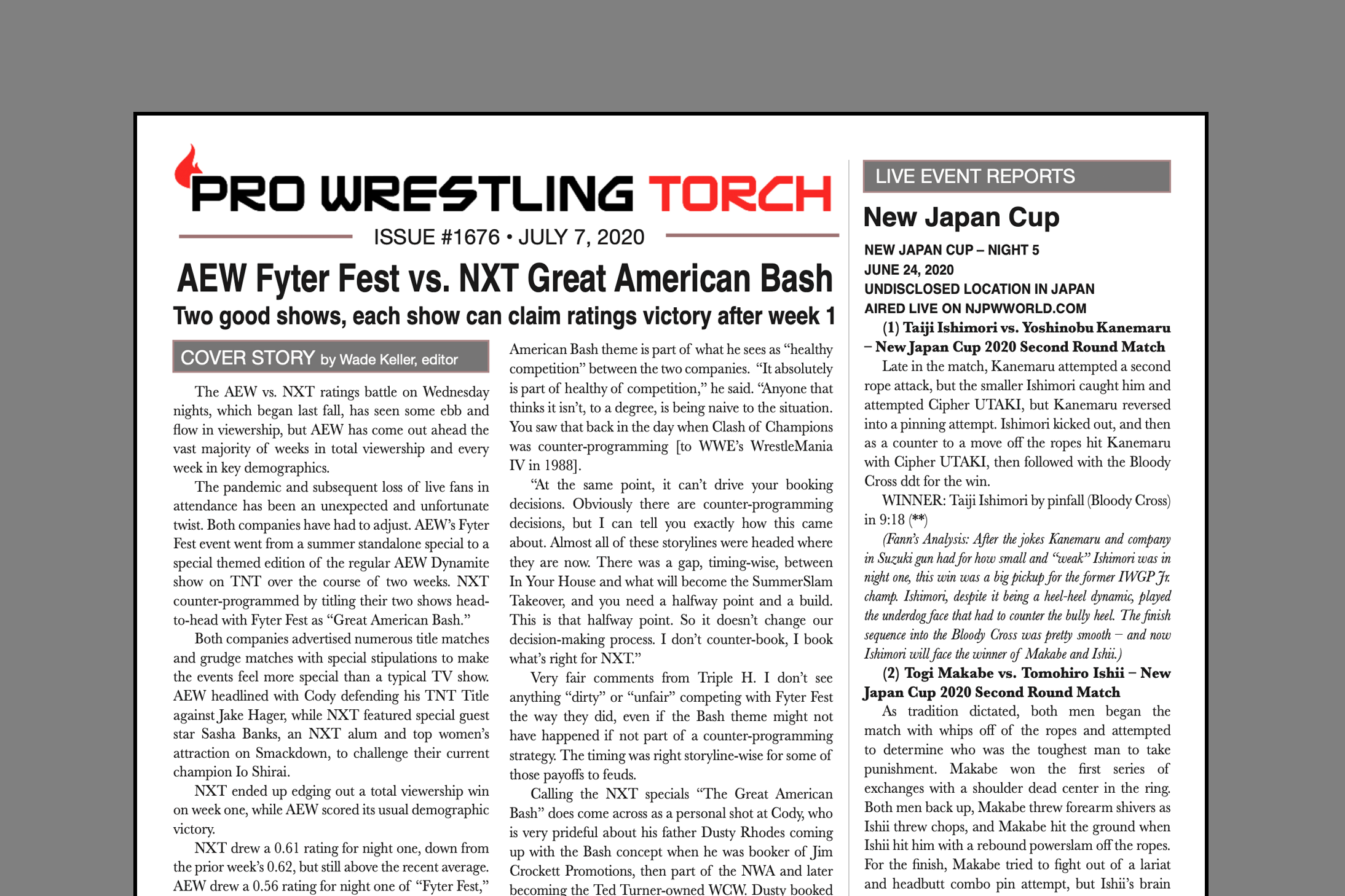 SUMMARY: This week’s PWTorch Newsletter features Wade Keller’s cover story on week one of the NXT Great American Bash vs. AEW Fyter Fest… Keller’s End Notes breaking down NXT’s biggest viewership win over AEW on June 24 including minute-by-minute trends and what lost and gained viewers… Greg Parks’ feature column looking at WWE’s wins & losses on Go Home TV shows and what it typically indicates for their PPV performances… More New Japan Cup coverage… Keller’s TV reports on NXT, AEW, Raw, and Smackdown… And more…
