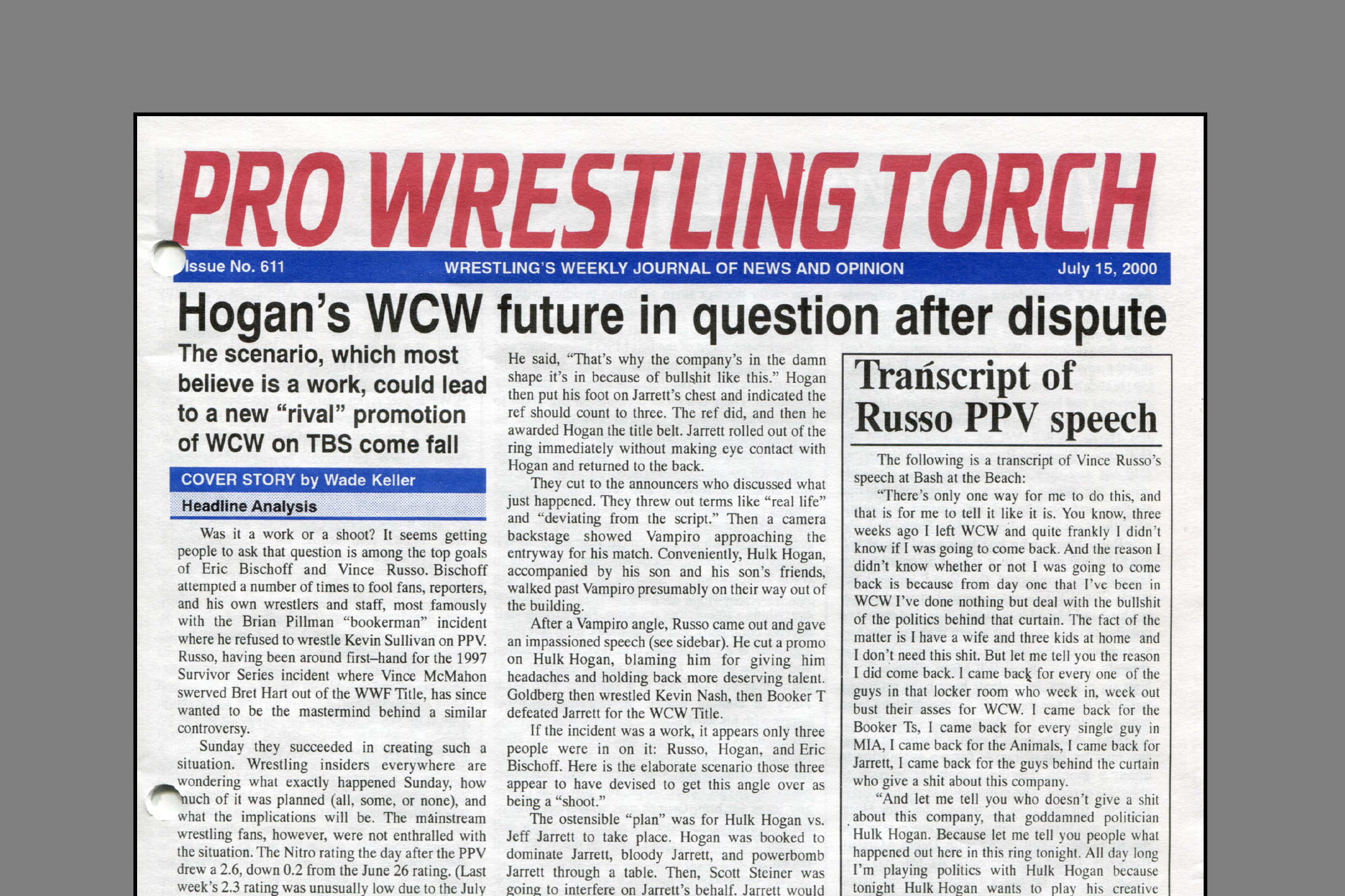 SUMMARY of #611 cover-dated July 15, 2000: This issue includes a a cover story on the controversy with Vince Russo cutting a shoot promo on Hulk Hogan at the Bash at the Beach PPV (that eventually led to a lawsuit), including a transcript of what Russo said, Wade Keller’s feature editorial breaking it down, and more… Detailed WCW Bash PPV coverage including Keller’s match report with star ratings, Roundtable Reviews, Reader Reax, and Poll Results… WWF Newswire with WWF’s reaction to a major advertiser pulling ads from Smackdown, Rena Mero looking for work after suing the WWF, Steve Austin neck update, and more… WCW Newswire with details on Hulk Hogan’s contract and Scott Hall’s status… ECW Newswire with the latest on the odds of getting onto USA Network… Keller’s End Notes on Booker T’s first interview that meant something… Reports on Raw, Nitro, Smackdown, ECW TV, Heat, and more…