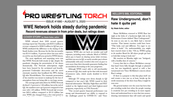 SUMMARY: This week’s PWTorch Newsletter features Wade Keller’s cover story on the WWE Financials including WWE Network subs holding steady… Keller’s End Notes looking at the AEW-NXT schedule shake-up and the minute-by-minute comparison of Jon Moxley and MJF last week… Greg Parks column reviewing the new Ken Shamrockbook… Zack Heydorn’s column looking at who has risen during the empty-arena era… Keller’s TV reports on Raw, Smackdown, and AEW… Keller’s Page 2 News including first Impact ratings of the year… Keller’s BBL editorial on the Raw Underground concept with an addendum of possible wrestlers who could benefit… Keller’s “Page 2 News”… And more…