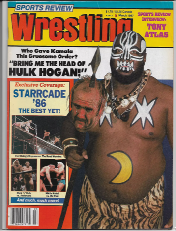 - Sports Review Wrestling Magazine – March 1987. The old saying “red equals green” has often been used to describe gory pictures of a bloodied Bobby Heenan on 1970s magazine covers. Long before Photoshop was a thing, Sports Review Wrestling took things a step further. This memorable cover shows Kamala holding a spear with the bloodied, severed head of Hulk Hogan, with this headline: “Who Gave Kamala This Gruesome Order: ‘Bring Me the Head of Hulk Hogan!’” Finding one of these magazines in 2020 is no easy task; two recently sold on eBay for $19.99 and $24.95, respectively.