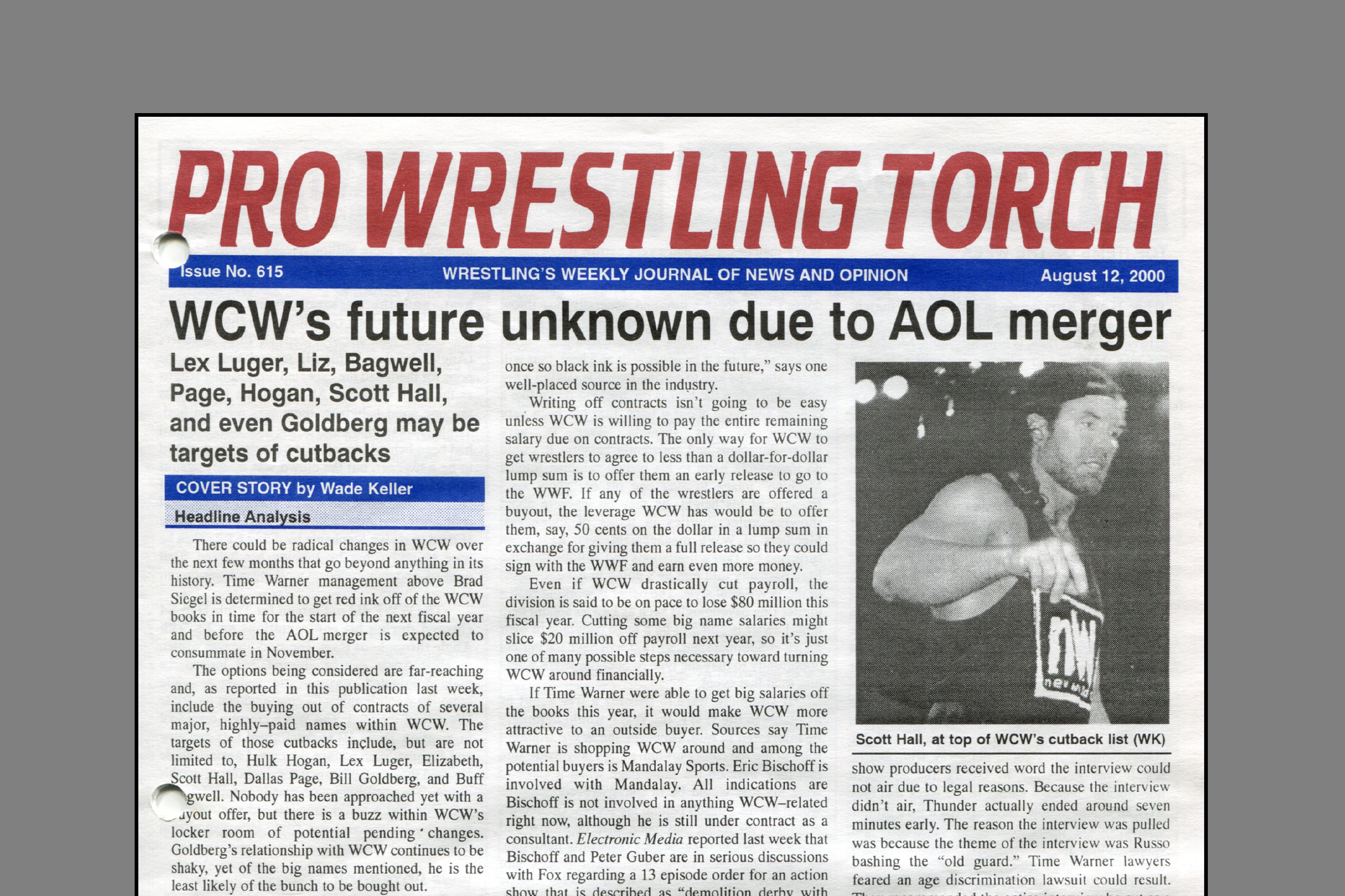 SUMMARY of #615 cover-dated August 12, 2000: This issue includes a cover story on the rumors and ramifications of the pending AOL-Time Warner merger as it related to WCW… Bruce Mitchell’s feature column looks at wrestling fans and their qualifications to vote… Wade Keller’s feature column looks at Vince Russo’s failed attempt to blend pro wrestling and reality TV… WCW Newswire details an inner-office memo in WCW that mocked Vince Russo, plus the latest on Goldberg’s problems with management… WWF Newswire details Summerslam’s line-up, The Rock’s involvement in the Republican National Convention, the prospects of Goldberg coming to the WWF, and much more backstage news… ECW Newswire details the latest rumors about ECW’s TV future as its days on TNN ended… … Plus reports on Raw, Nitro, ECW TV, Smackdown, and other shows, Letters to the Torch, Wade Keller’s End Notes, and more…