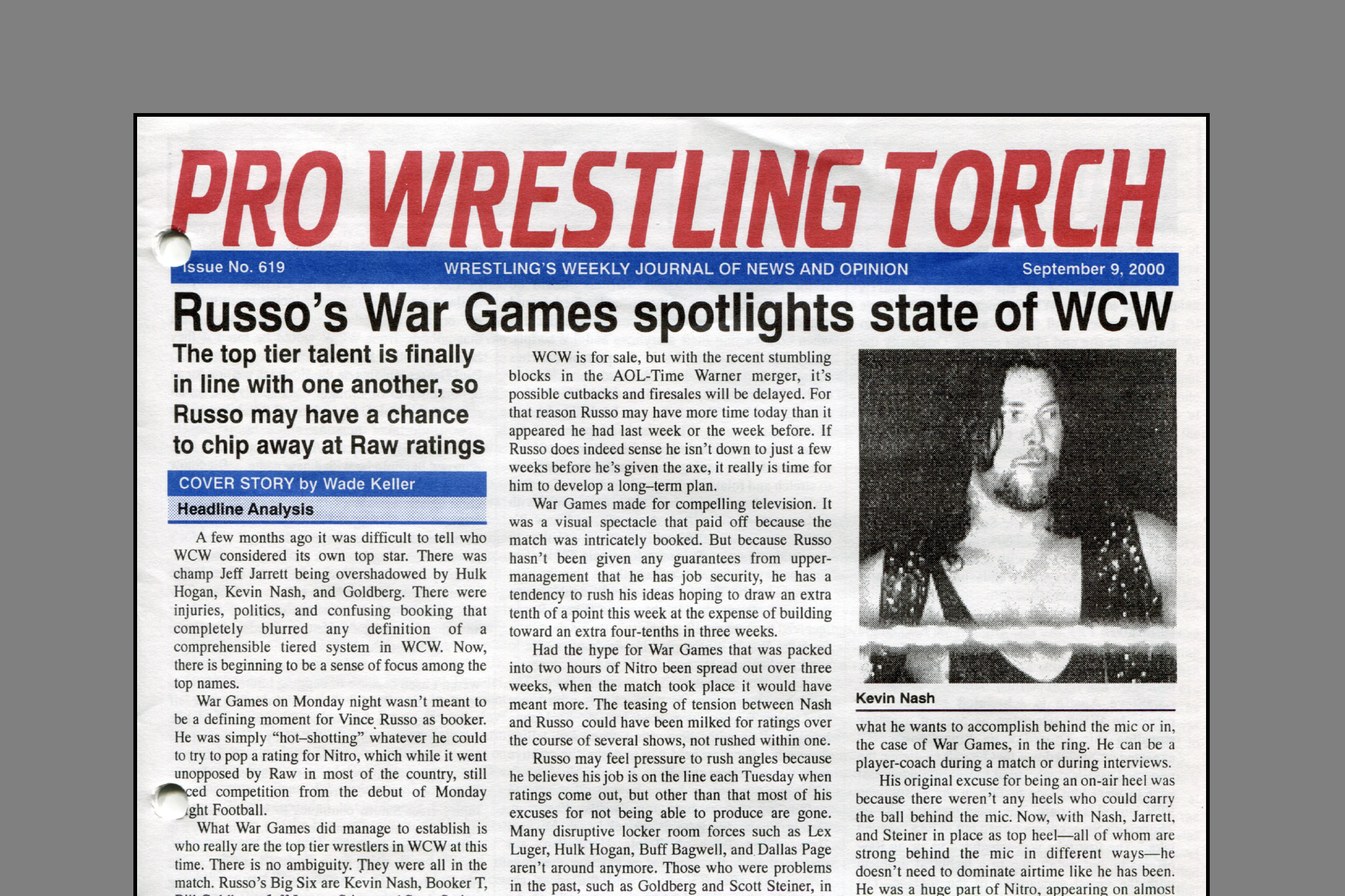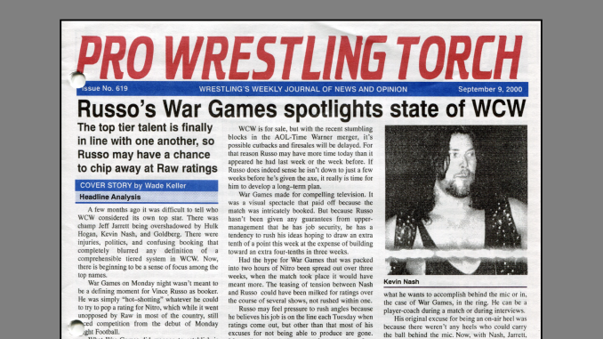 SUMMARY of #619 cover-dated September 9, 2000: This issue includes a cover story on Vince Russo’s War Games and how it spotlights WCW top tier at the moment… WCW Newswire details another episode of Goldberg snapping backstage… WWF Newswire details the latest legal battle between USA and TNN… ECW Newswire has the latest backstage news… Bruce Mitchell writes about his trip of Las Vegas and parallels between that world and pro wrestling… Wade Keller’s End Notes looks at ten years of Bruce Mitchell writing for the Torch… Plus reports on Raw, Nitro, ECW TV, Smackdown, and other shows, Letters to the Torch, and more…