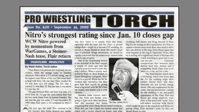 SUMMARY of #620 cover-dated September 16, 2000: This issue includes a cover story on Flair’s return, War Games, and a Nash-Steiner tease leading to a Nitro ratings surge… WWF Newswire covers the USA-WWF legal battle and backstage news… WCW Newswire details a Russo-Wrestler Meeting commotion and early talk of Eric Bischoff buying WCW, and drug sniffing police dogs at WCW event… ECW Newswire covers payroll problems… Wade Keller’s feature BBL editorial is headlined: “Bret is now complaining about complaining”… Plus reports on Raw, Nitro, ECW TV, Smackdown, and other shows, Letters to the Torch regarding Ric Flair’s WCW return, ETC. Newswire and more…