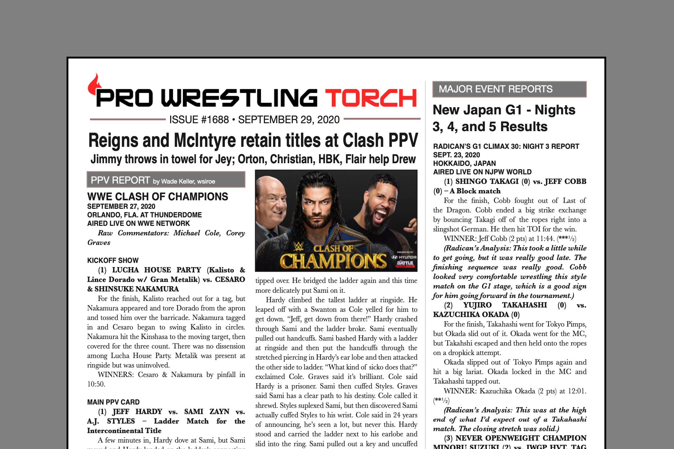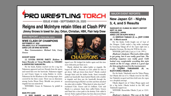 SUMMARY: This week’s PWTorch Newsletter features Wade Keller’s WWE Clash of Champions PPV report… NJPW G1 Climax Tournament reports from three different staff writers covering nights 3, 4, and 5… Greg Parks’s feature column with 12 items that made last week’s Raw one of the worst ever… Keller’s reports on Raw, Smackdown, and Dynamite… Keller’s Page 2 News… And more…