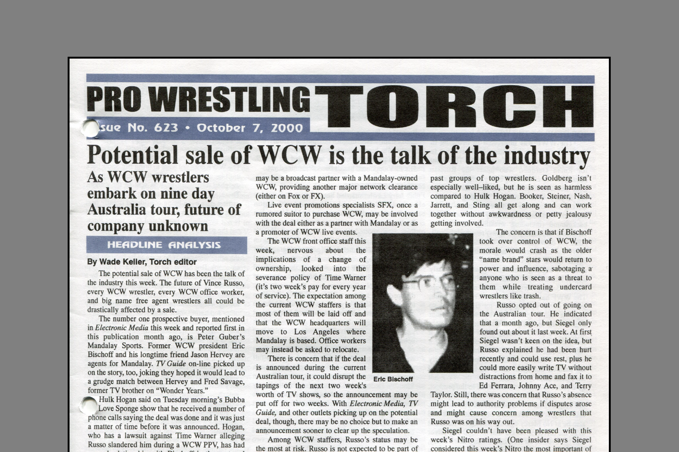SUMMARY of #623 cover-dated October 7, 2000: This issue includes a cover story on the potential sale of WCW being the talk of the industry – the beginning of the Torch’s industry-leading coverage of the biggest story perhaps in the history of pro wrestling… WWF Newswire with details on another Olympic wrestler being courted among many behind the scenes items not reported anywhere else… WCW Newswire with details on Dallas Page discussing a return to WCW, Goldberg on Daily Show, and Vince Russo’s job in jeopardy, plus other backstage news… ECW Newswire with notes on Paul Heyman being upset with claims that he told wrestlers a deal with USA Network was done… Detailed coverage of ECW Anarchy Rulz with Jerry Lynn defeating Justin Credible to capture the ECW World Title… Part one of a “Torch Talk” with new ECW World Champion Jerry Lynn… Wade Keller’s End Notes looks at intriguing Presidential Debates with wrestling personalities instead of politicians… Plus reports on Raw, Nitro, ECW on TNN, Smackdown, Thunder, and other TV shows…