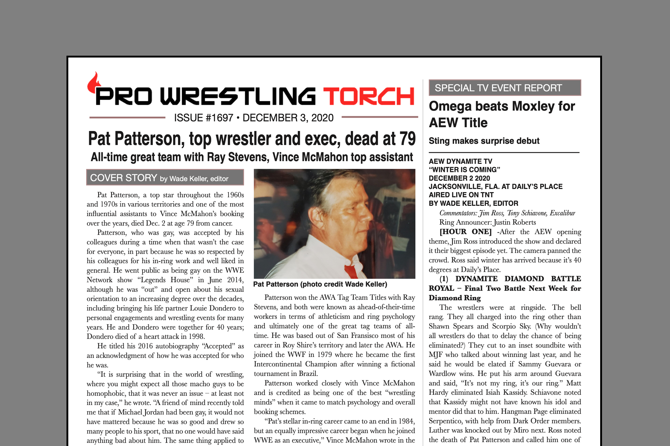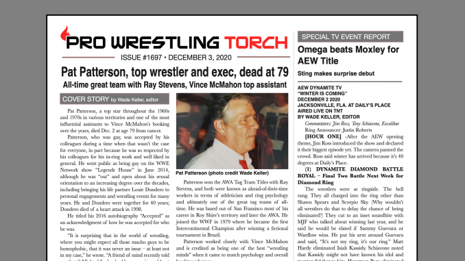 SUMMARY: This week’s PWTorch Newsletter features Wade Keller’s cover story on Pat Patterson… Keller’s AEW “Winter is Coming” report on Sting’s debut and Kenny Omega’s AEW Title win over Jon Moxley, plus Keller’s newsletter-exclusive VIP reports on NXT on USA… Bruce Mitchell’s column on Roman Reigns’s heel act… Greg Parks’s feature column on wrestling authority figures… And more…