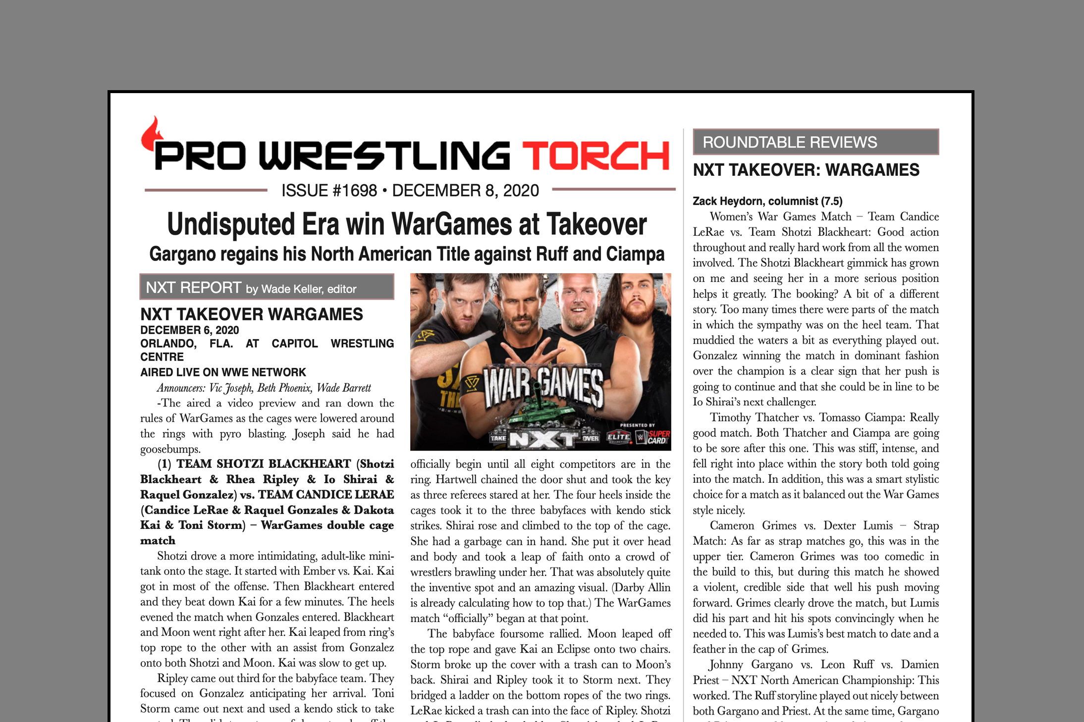 SUMMARY: This week’s PWTorch Newsletter features Wade Keller’s Keller’s NXT Takeover WarGames match report, analysis, and star ratings… NXT Takeover Staff Roundtable Reviews and Scores… Greg Parks feature column looks at the mysterious Impact-AEW alliance… Torch Newswire with details on the ratings last week… Keller’s newsletter exclusive reports on NXT on USA, plus Monday Night Raw and WWE Smackdown TV reports…