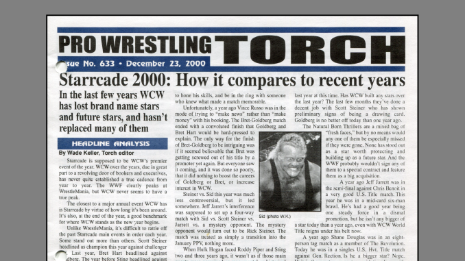 SUMMARY of #633 cover-dated December 23, 2000: This issue’s cover story compares Starrcade 2000 to previous Starrcades over the years… Detailed coverage of Starrcade 2000 including Keller’s Match Report with star ratings, Roundtable Reviews, and Reader Reax with Poll Results… ECW Newswire details potential suitors to purchase the company… WWE Newswire details sagging ratings and backstage observations about the XFL affecting Vince McMahon’s time dedicated to WWF matters… WCW Newswire details the Dallas Page-Scott Steiner backstage fight… Part two of a Torch Talk with new ECW Champ Steve Corino… Wade Keller’s “End Notes” on Vince McMahon’s swerve… Plus reports on Raw, Nitro, Smackdown, Thunder, ECW TV, and more…