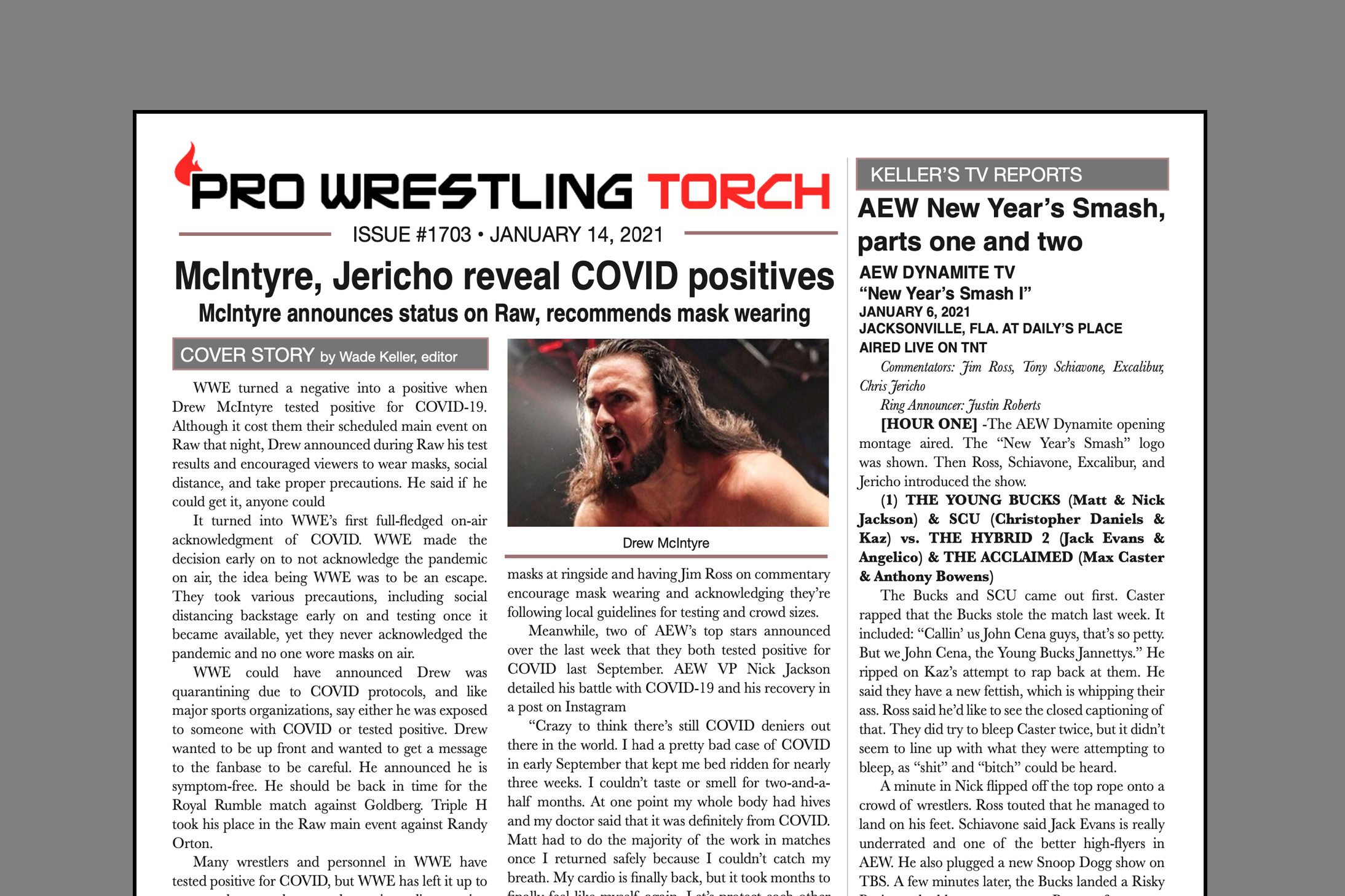 SUMMARY: This week’s PWTorch Newsletter features Wade Keller’s Keller’s cover story on Drew McIntyre and Chris Jericho revealing COVID positives… Greg Parks column revealing his annual Parksy Awards… Keller’s AEW New Year’s Smash I & II coverage… Impact Wrestling Genesis 2012 Report… Keller’s TV Reports… Torch Newswire… More…