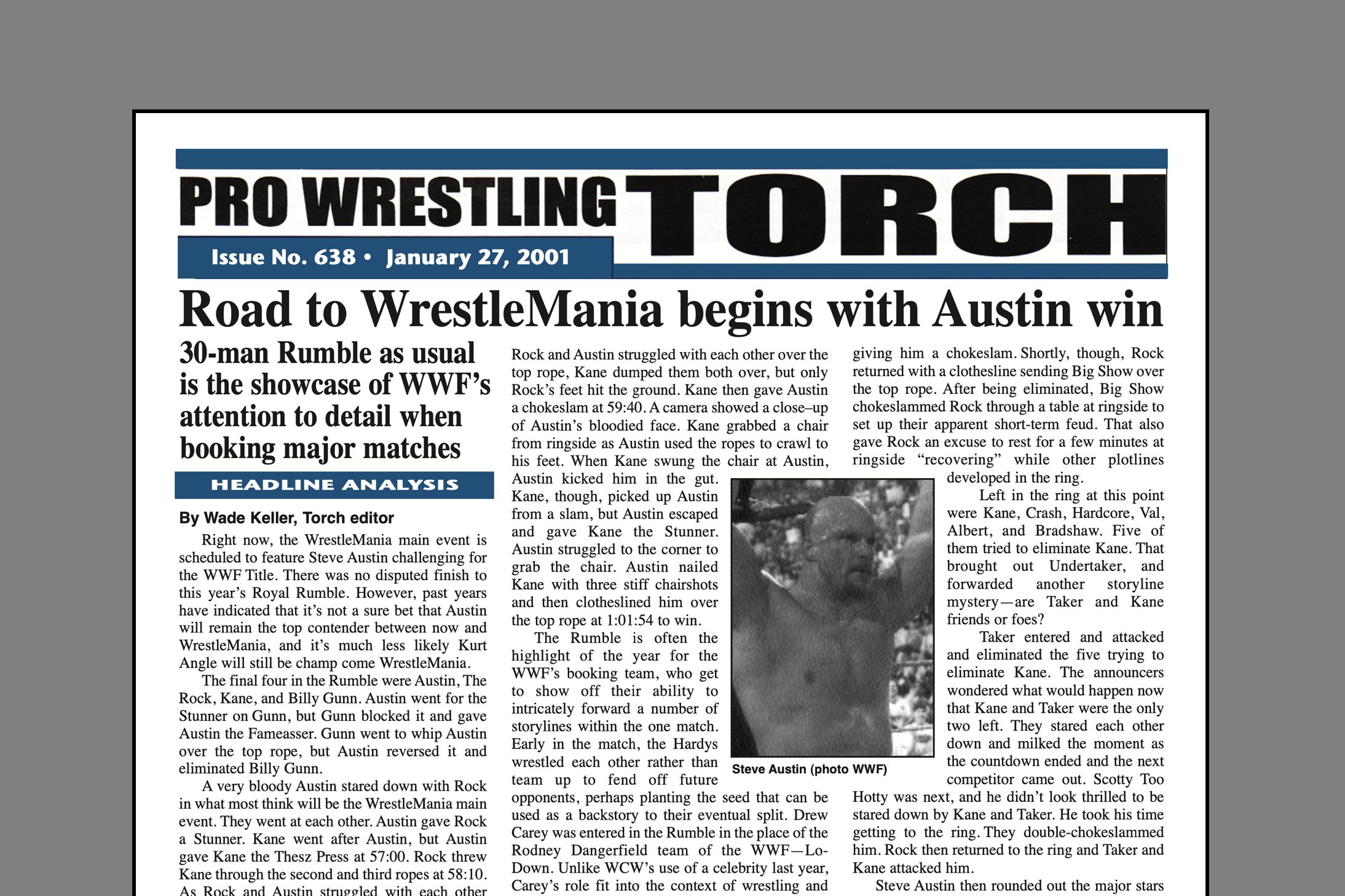 SUMMARY of #638 cover-dated January 27, 2001: This issue includes a Cover Story on Steve Austin’s Royal Rumble win marking the first step toward WrestleMania… In-depth coverage of Royal Rumble including Wade Keller’s match report and star ratings, Roundtable Reviews, Reader Reax, and Poll Results… WWF Newswire with details of Shawn Michaels signing a contract extension… WCW Newswire covers Scott Steiner being charged with criminal assault of a backstage worker, talk of a Sid lawsuit for his gruesome leg break, Goldberg comments on becoming a free agent, and more on WCW sale rumors… Wade Keller’s editorial on the end of ECW… Part two of the Bill Goldberg Torch Talk including his thoughts on jobbing to Kevin Nash, kicking out before three against Bret Hart, and whether he dogged his heel persona on purpose… Plus reports on Raw, Nitro, Thunder, Smackdown, and more…