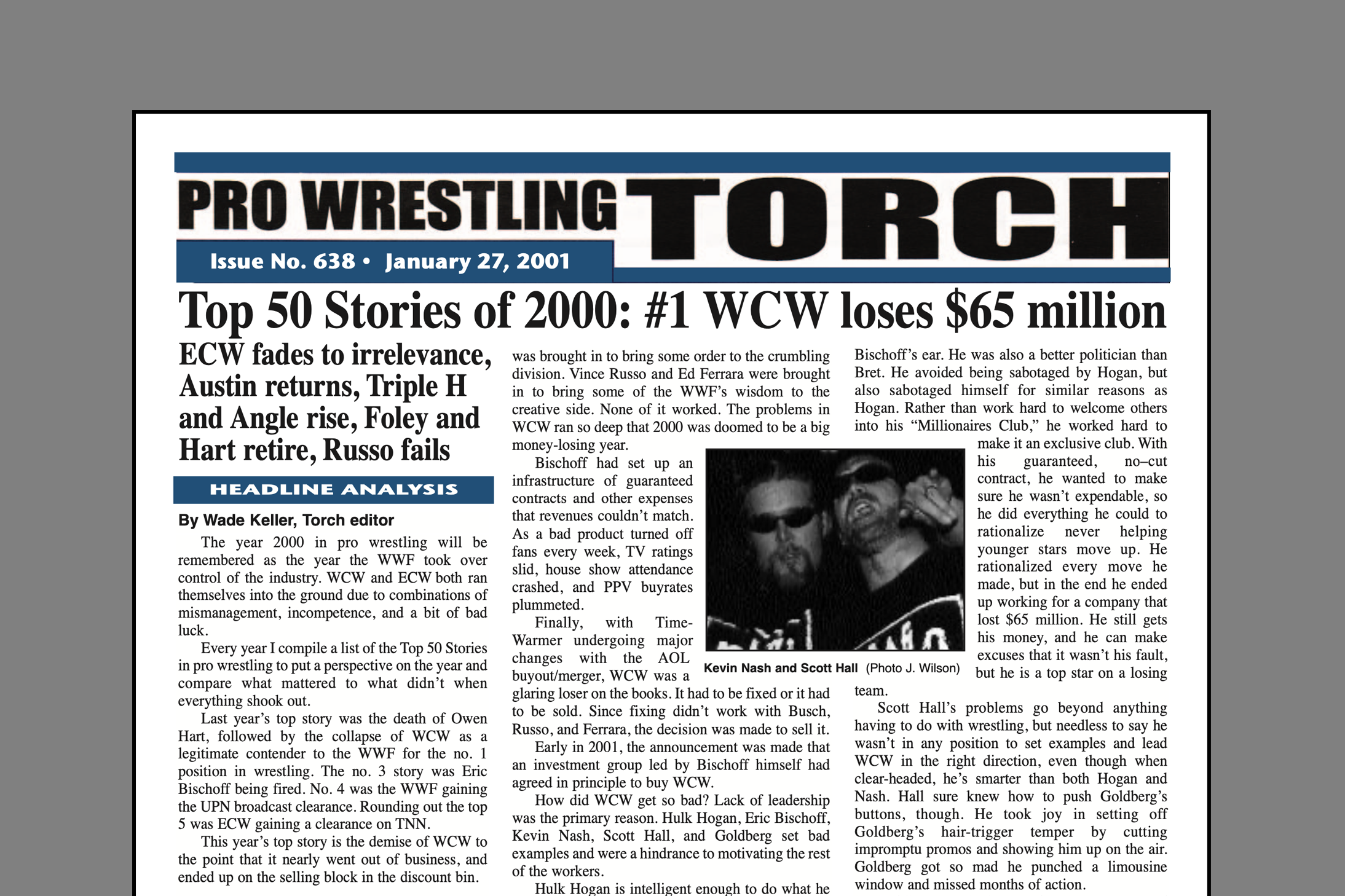 SUMMARY of #639 cover-dated February 4, 2001: This issue includes a Cover Story on the Top 50 Stories of 2000… WWF Newswire details Shawn Michaels’s future, additions to the WWE scriptwriting team, Jim Ross and Jerry Lawler’s new job, backstage news, and talent roster changes… WCW Newswire reports on Eric Bischoff holding a talent meeting now that it appeared he was in control of WCW again, plus Johnny Ace’s rise to power… ECW Newswire detailing WWF’s interest in various ECW wrestlers as ECW continues to show signs of fading away… Part three of the Goldberg “Torch Talk” with his thoughts on controversies involving limo windows, Chris Jericho, Triple H, Scott Halll, and more… Plus reports on Wade Keller’s End Notes, Raw, Nitro, Thunder, Smackdown, and more…