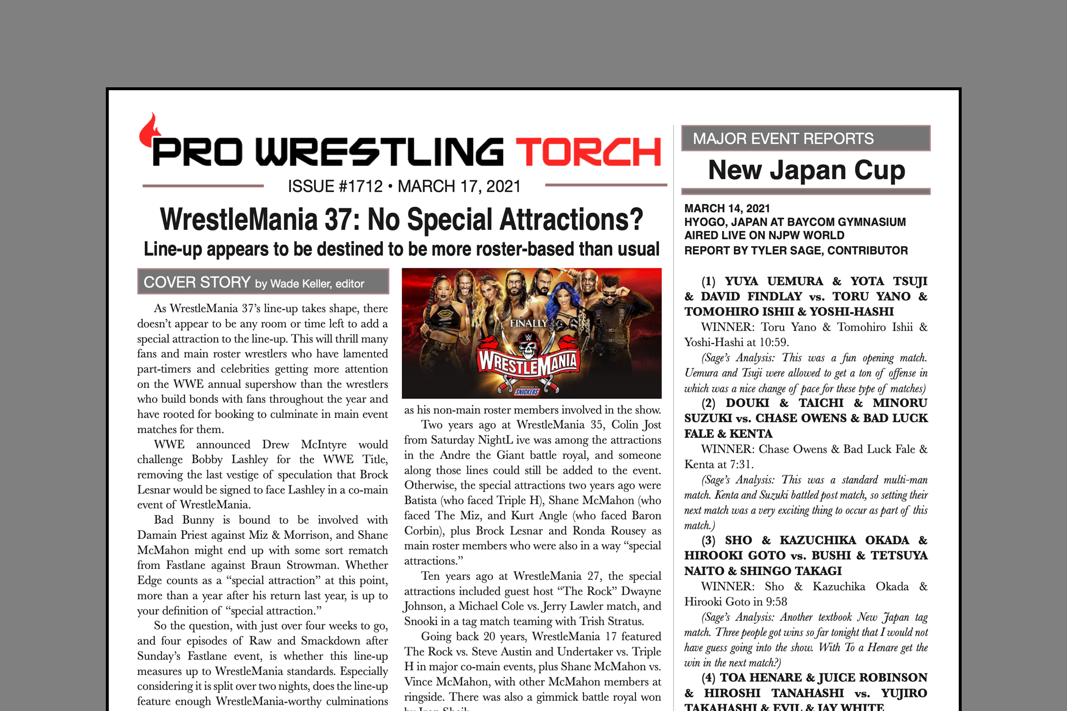 SUMMARY: This week’s PWTorch Newsletter features Wade Keller’s Cover Story on WrestleMania 37 taking shape with minimal special attractions… Greg Parks feature column on Andrade’s future… Keller’s TV Reports on AEW, NXT, Raw, Smackdown… New Japan Cup report… Torch Newswire… More…