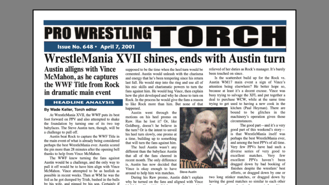 SUMMARY of #648 cover-dated April 7, 2001: This issue includes in-depth coverage of WrestleMania XVII including Steve Austin’s heel turn. Wade Keller’s “End Notes” asks: Why was WrestleMania so good?… WCW Newswire covers the fallout of the WWF buyout… WWF Newswire includes news on Jerry Lawler’s release, Shawn Michaels’s dispute with management leading to a walkout… Part three of the Mark Madden “Torch Talk” series… Plus reports on Raw and Smackdown, and more…