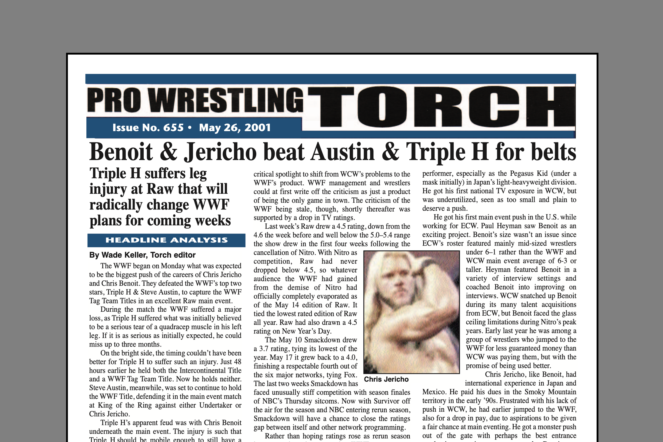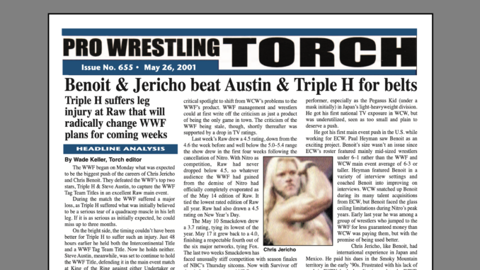 SUMMARY of #655 cover-dated May 26, 2001: This issue begins with a cover story on Triple H’s serious quad injury in a Raw main event… Part five of the Jerry Jarrett “Torch Talk” features his fascinating insight into Shane and Stephanie McMahon when they were younger… In-depth coverage of WWE Judgment Day including Keller’s match report and star ratings, Roundtable Reviews, Reader Reax, and Poll Results… Torch Roundtable special with analysis of what was going wrong with the WWF after such a hot run in previous years… Wade Keller’s End Notes longs for the return of squash matches… Tons of insider news from the WWF, WCW, and more… Also, Letters to the Torch, reports on Raw and Smackdown, ETC. Newswire, and more…