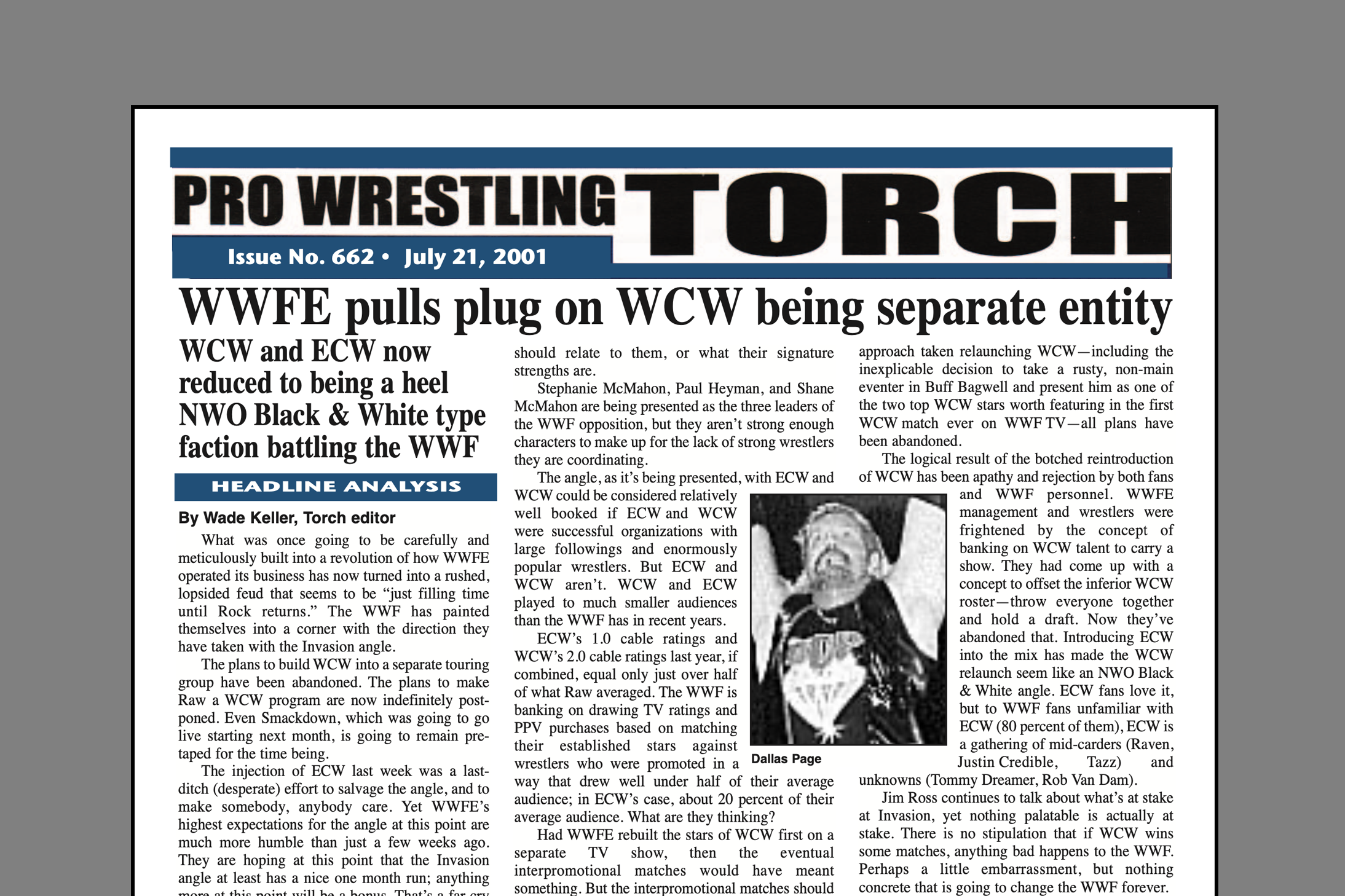 VIP 2001 BACK ISSUE – Pro Wrestling Torch #662 (July 21, 2001): The inside story on the WWF pulling the plug on WCW as a separate entity, Dallas Page upsets Taker at house show, Torch Talk with Jerry Lawler, Ask the Torch, more