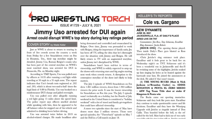 SUMMARY: This week’s PWTorch Newsletter features Wade Keller’s Cover Story on the Jey Uso DUI arrest and its potential impact on the central WWE storyline, and how Smackdown viewership headed into the post-ThunderDome era is at a low point… Alan Counihan’s newsletter-exclusive column looks at the history of upstart wrestling companies in Japan and the latest, Gleat!… Part two of Greg Parks looking at the latest WWE roster cuts… Keller’s newsletter-exclusive NXT Great American Bash report… Keller’s TV reports on Raw, Smackdown, and AEW Dynamite… Torch Newswire… And more…