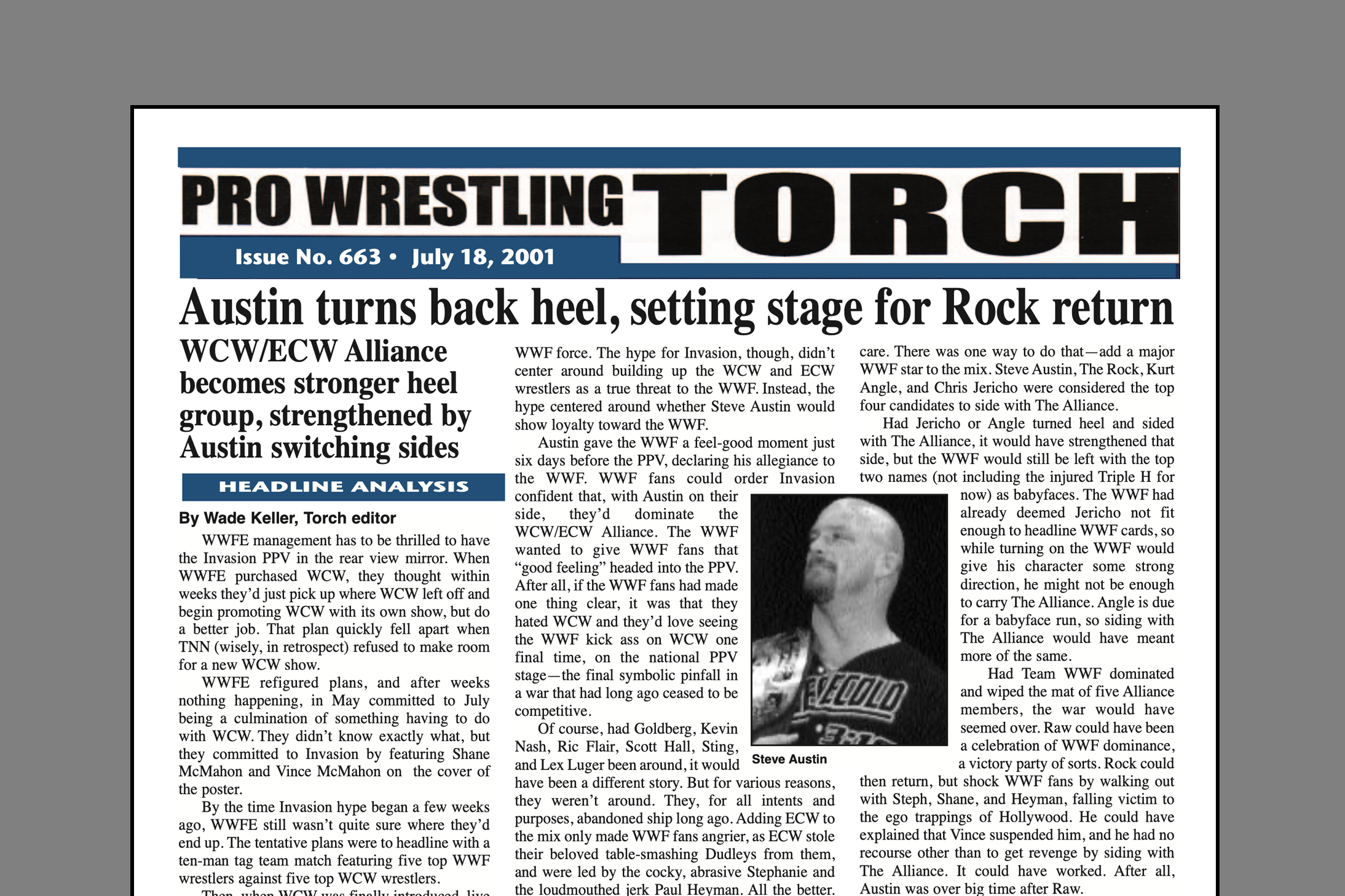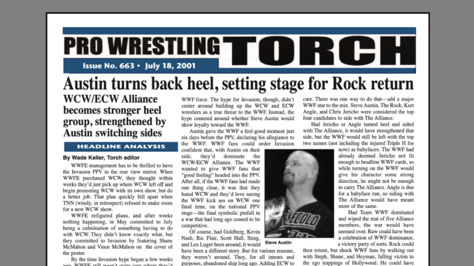 SUMMARY of #663 cover-dated July 28, 2001: This issue includes in-depth coverage of the WWF Invasion PPV with Keller’s match report with star ratings, Roundtable Reviews, Reader Reax, Poll Results, and a Cover Story overview… Keller’s End Notes looks ahead at the future of the WWF/WCW/ECW set-up… Bruce Mitchell’s feature looks at The Freebirds… Part five of the Torch Talk with Jerry Lawler with a look at the Memphis wrestling legacy… WWF Newswire looks at the beginning of the WWF-ECW situation, Steve Austin’s neck update, and more… WCW Newswire details the end of the WCW relaunch plans… Plus reports on Raw and Smackdown, ETC. Newswire, and more…