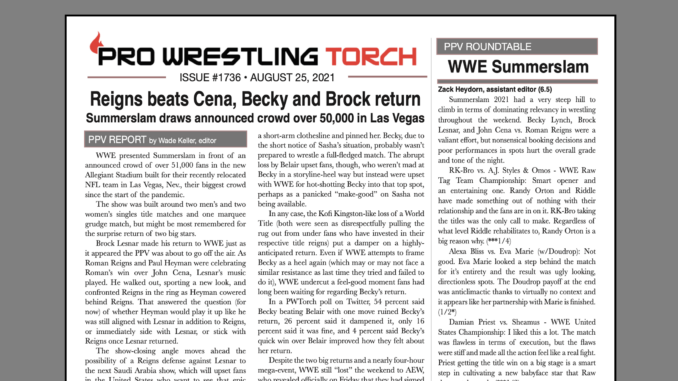 SUMMARY: This week’s PWTorch Newsletter features Wade Keller’s cover story on WWE Summerslam including fan reaction and poll responses along with analysis and context of what Summerslam will be remembered for… Keller’s complete and detailed Summerslam PPV report including results, match analysis, and star ratings… PPV Roundtable Reviews for Summerslam and scores and reviews from the staff… Greg Parks’s feature column on how he became the center of a barrage of backlash on Twitter… An expanded WWE Newswire with details on Summerslam, Roman Reigns talking about Jimmy Uso’s DUI arrest, Keith Lee updating his health, Summerslam statistics, and more… Keller’s reports on Smackdown and Raw… And more…